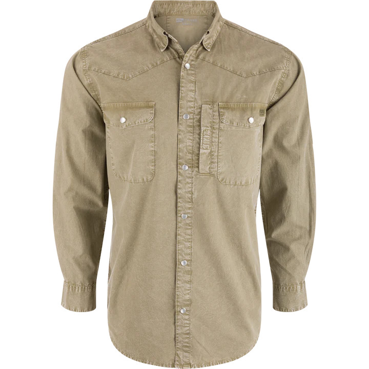 The Drake Cinco Ranch Western Acid Wash Cotton Shirt is garment washed to give you the softness and comfort of a well broken in shirt with high-low contrast that is unique to each garment The Drake Cinco Ranch shirt is packed with features: a western classic fit, Faux Pearl Snaps, a hidden button-down collar, a vented Western back cape, two snap button chest pockets with a Magnattach closure on the left pocket. It has a sculpted hem which allows you to wear tucked or untucked and has an adjustable tab if you want to roll up your sleeves. Inside the hem is a built-in sunglass wipe. The Cinco Ranch Western Shirt will perform whether you are on the range or on the town.