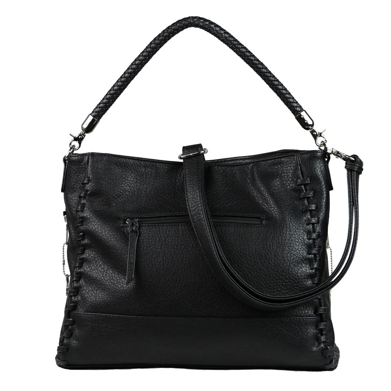 The Lily Tote by Lady Conceal is crafted with soft, faux leather and adorned with lacing. The interior is divided into two parts by the concealment pocket. The front features two open slip pockets, the back has a zippered pocket, a large open pocket, and a key strap for quick access. Both sides are secured with a magnetic closure. This purse includes a beautiful braided short strap and a long double-ply crossbody strap.
