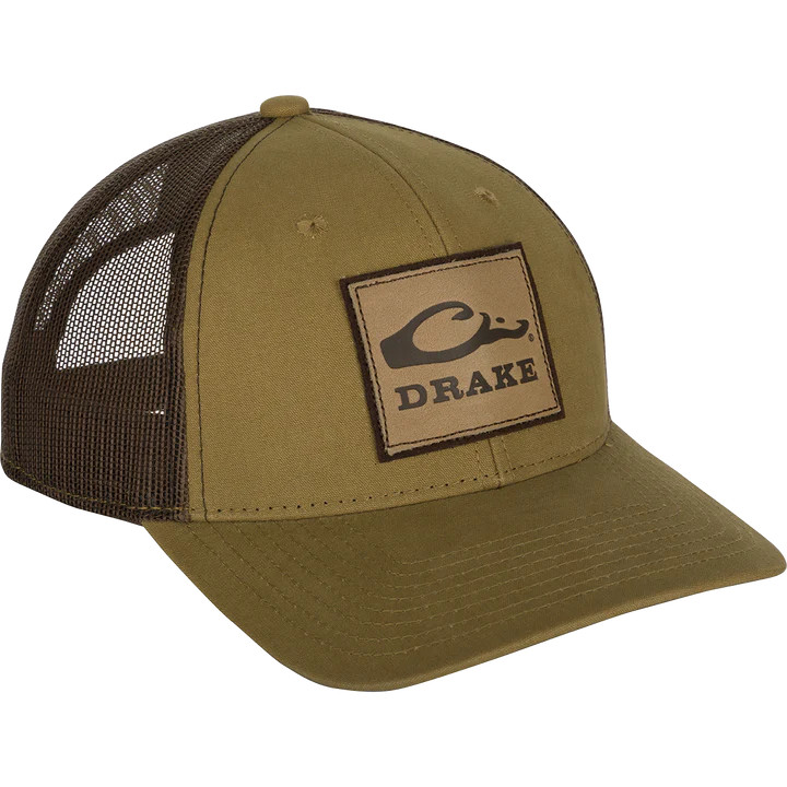 The Drake Leather Patch Mesh Back Cap is a weathered cotton/poly structured six-panel combined with a polyester mesh snapback. It is constructed in a traditional trucker shape and has a slightly pre-curved visor. The patch is a debossed leather stamped with the Drake Logo. This cap is both comfortable and ruggedly handsome. From our Drake Logo Series.