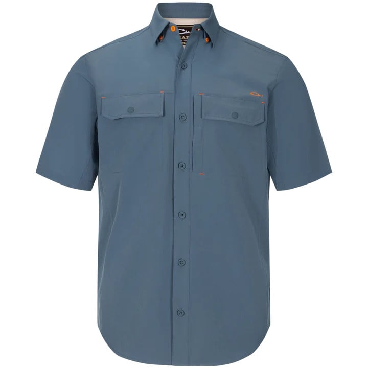 We set out to develop a performance shirt that is home on the water or on the trail. The Drake Lake Shore Shirt has our best features, including built-in stretch and moisture wicking from our lightweight polyester/spandex performance fabric. It has a UPF30 rating for sun protection as well. The Lake Shore has a classic fit, a hidden button-down collar, two button-through flap chest pockets, and a vented cape back along with laser punched side panels. The pocket system includes a Magnattach closure behind the left pocket. It has a sculpted hem which allows you to wear tucked or untucked and inside the hem is a built-in sunglass wipe. We took a classic and added a ton of technical features, creating a new Drake standard in performance shirts.