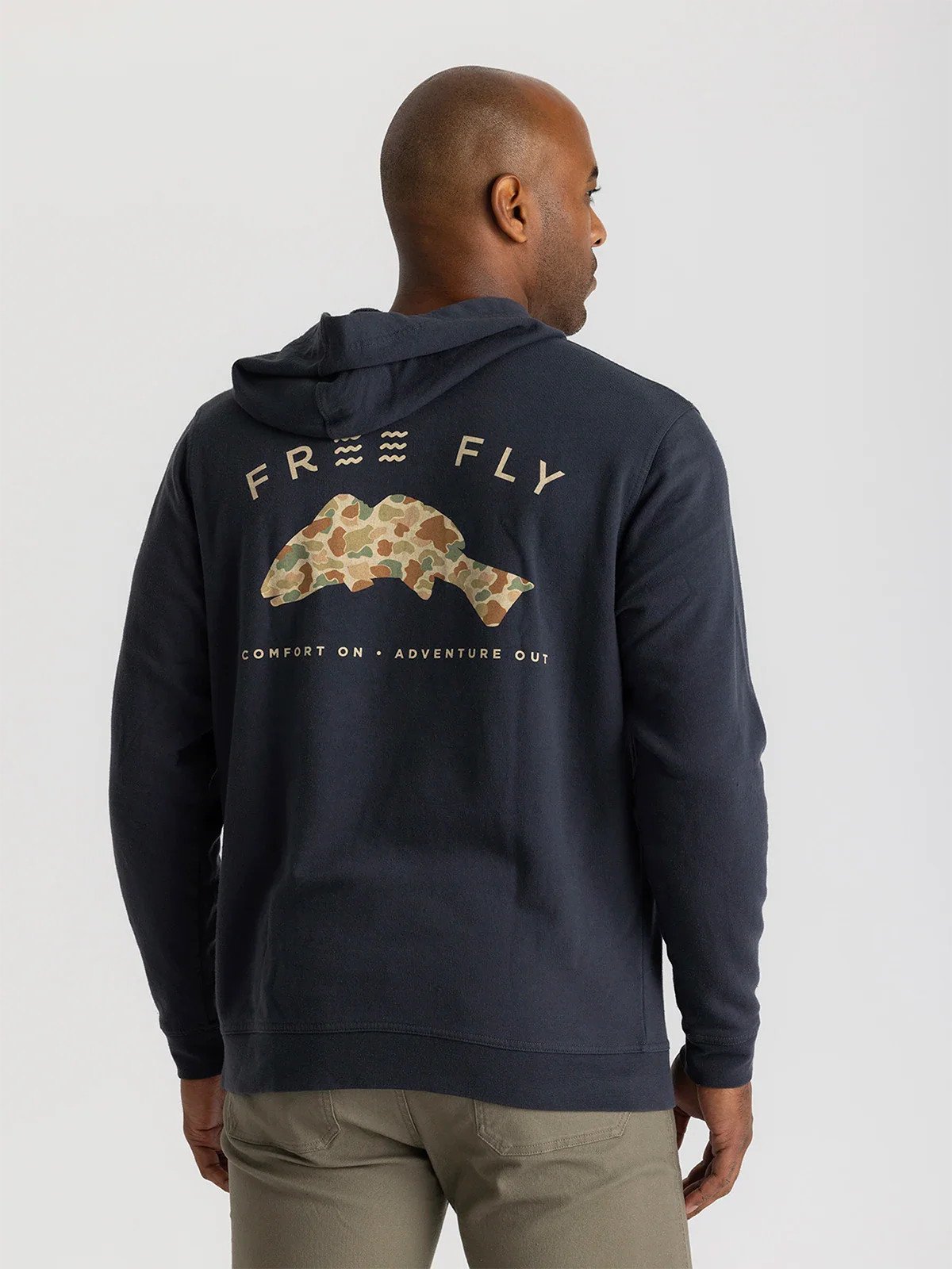 Sometimes the best way to kick back is with a classic. That’s why we designed our Vintage Camo Redfish Fleece Hoodie. This ultra soft, washed fleece is so comfy, it just begs to be worn on chilly morning adventures or as a post-shower-and-a-beer unwinding layer. For this hoodie, we took an archival camouflage print, and combined it with our favorite local marsh critter.